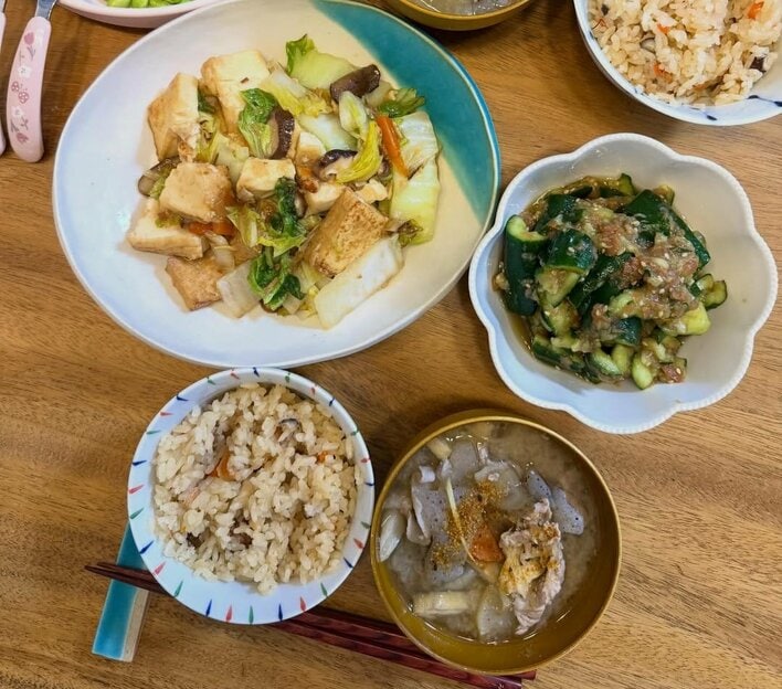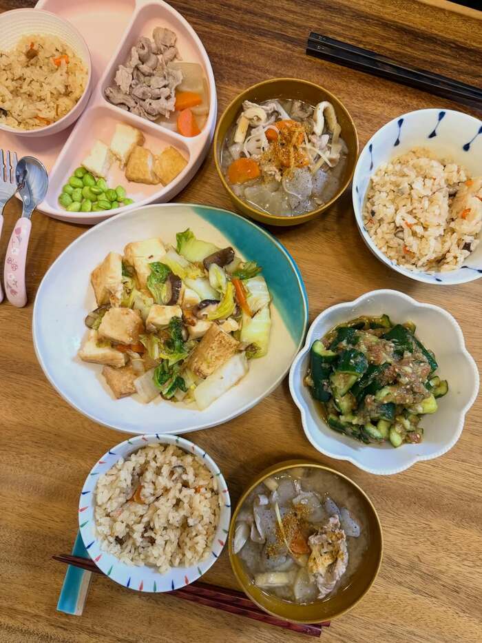 今回の投稿では「今日は1日休みだったので夜ご飯作り頑張った」とつづり、家族全員分の手料理を披露しています。