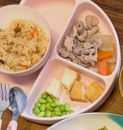 ピンクのお茶わんには炊き込みご飯、1つのスペースには豚汁用に作られた豚バラやにんじん、大根が入っています。もう一方には、厚揚げや枝豆があり、自分たちの料理と並行して子供の料理も作ったようです。