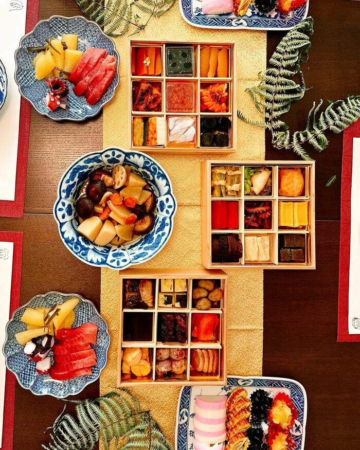 食卓には黒豆やかまぼこ、伊達巻きなどといった種類豊富で豪華なおせち料理がずらりと並んでいます。