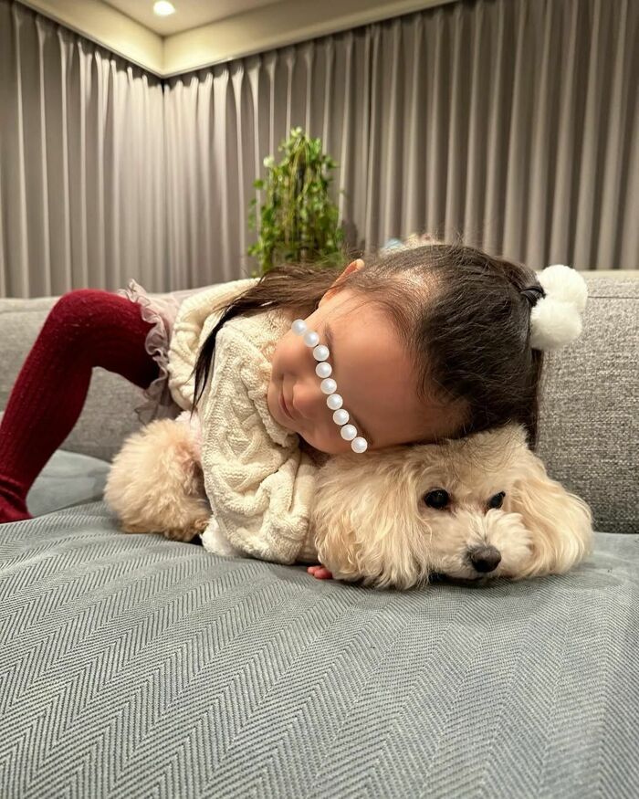 愛犬を大切そうに抱きしめる娘の姿も披露。