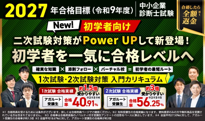 2027年(令和9年度)合格目標 中小企業診断士試験/1次試験・2次試験対策入門カリキュラム/フル・ライトをお申込みいただいた方が令和9年度の中小企業診断士試験に合格された場合、合格特典(全額返金orお祝い金)がございます。