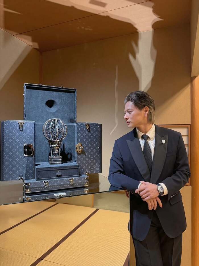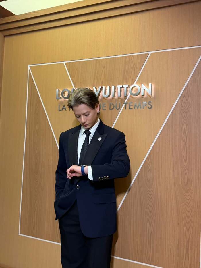 今回の投稿では「ルイ・ヴィトンのハイウォッチ&ハイジュエリー展示会へ。」とつづり、タキシード姿のショットを公開しました。