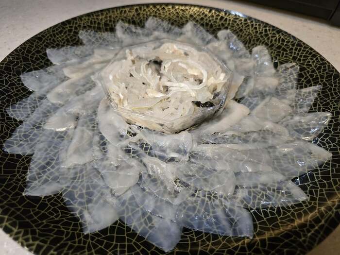 黒いお皿に、薄く切ったフグが花のように盛られていて、とても美しいです。さらに、中心にフグ皮までそえられた、なんとも贅沢なおつまみ。