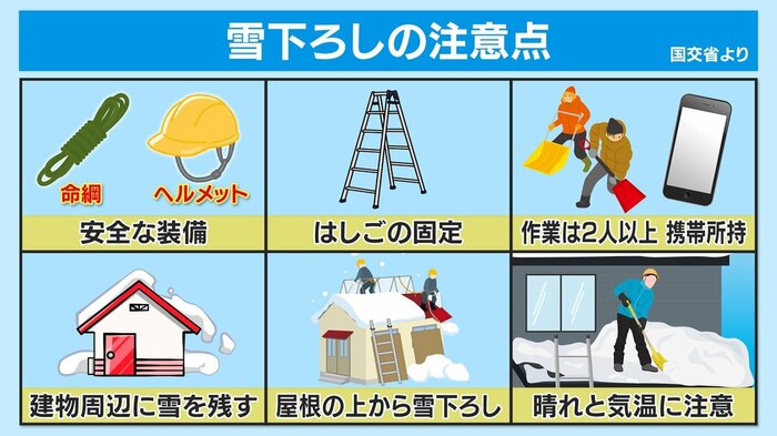 また、雪下ろしの際の注意点として、国土交通省は以下のことに注意を呼びかけています。