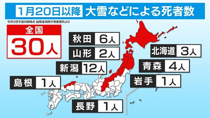 消防庁によると、1月20日以降、大雪に関連した死者は、全国で30人にのぼっています。