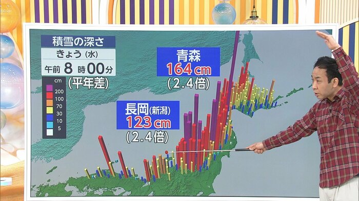 天達武史気象防災キャスターによると、今回の雪は短期集中型で、4日朝の時点で青森県では164cm、新潟・長岡市では123cmの積雪を記録。これは、平年の2.4倍ほどになります。