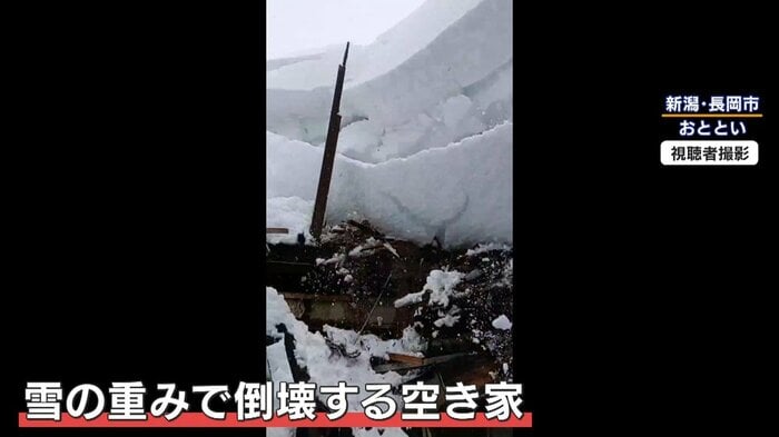 市内で撮影された映像には、大量の雪が積もった空き家がミシミシと音を立て…、雪の重さに耐えられず、倒壊する様子が。
