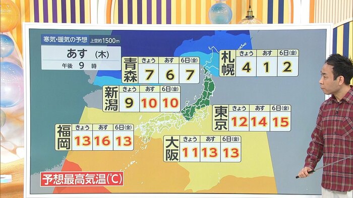 今後は、暖気がぐっと入ってくるので、4、5、6日と最高気温が上がってきます。札幌では普段この時期氷点下ですが、4日は4℃、青森でも7℃まで上がります。新潟も(5、6日は)10℃ですから、長岡などの豪雪地帯でも、どんどん雪がゆるんでくるというのが、今回気をつけたいところですね。