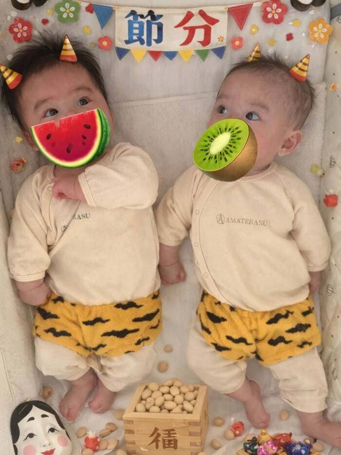 また、ベビーベッドに仲良く横になるショットを、スタンプでかわいくデコレーションしたものも!頭には小さな角が付き、鬼パンツ姿の双子は「節分」と書かれた飾りを見て驚くような姿を見せていて、なんともかわいらしいですね。