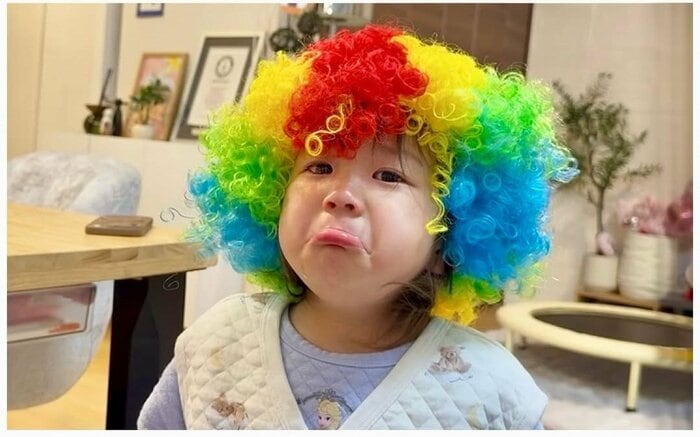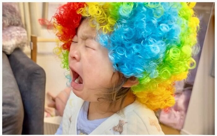 ののちゃんとおそろいのアフロをかぶりながらも、両目を閉じ、口を大きく開いて大号泣!