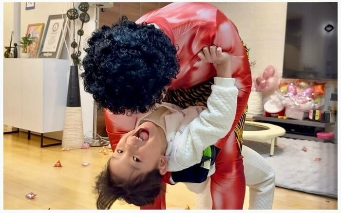 さらに、鬼の足に挟まりながら、ぐい~んと背中をのけぞらせて逆さまに。ののちゃん、怖がる気配はなく、笑顔がとっても楽しそう♪
