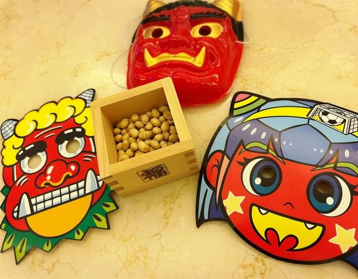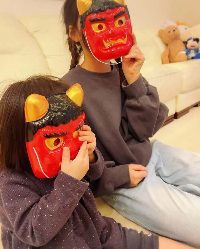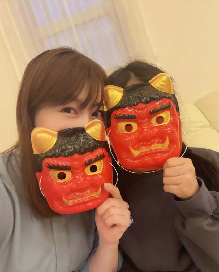 そして、鬼のお面と「福」と書かれた升に入った豆を並べたショットで「今年も鬼のお面と、豆まきを家族でしました」と、自宅で豆まきを楽しんだことを報告。