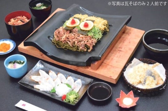 アツアツの瓦の上に風味豊かな茶そばを乗せ、錦糸卵や甘辛く煮た牛肉などの具材を盛りつけた、山口を代表するソウルフードです。