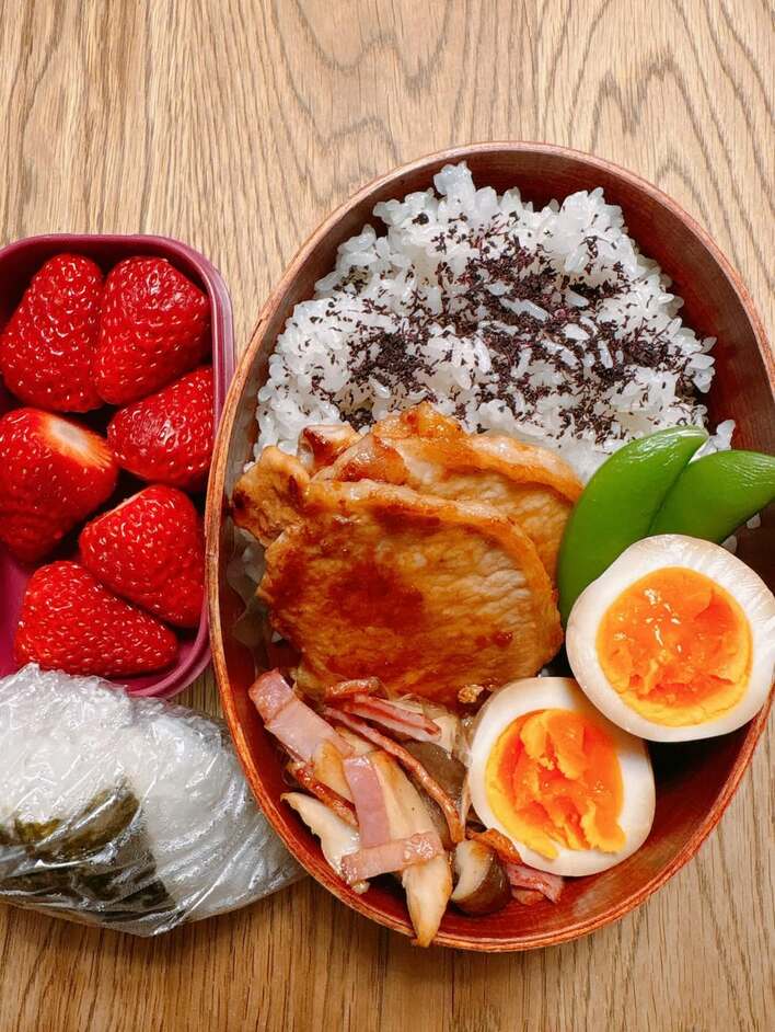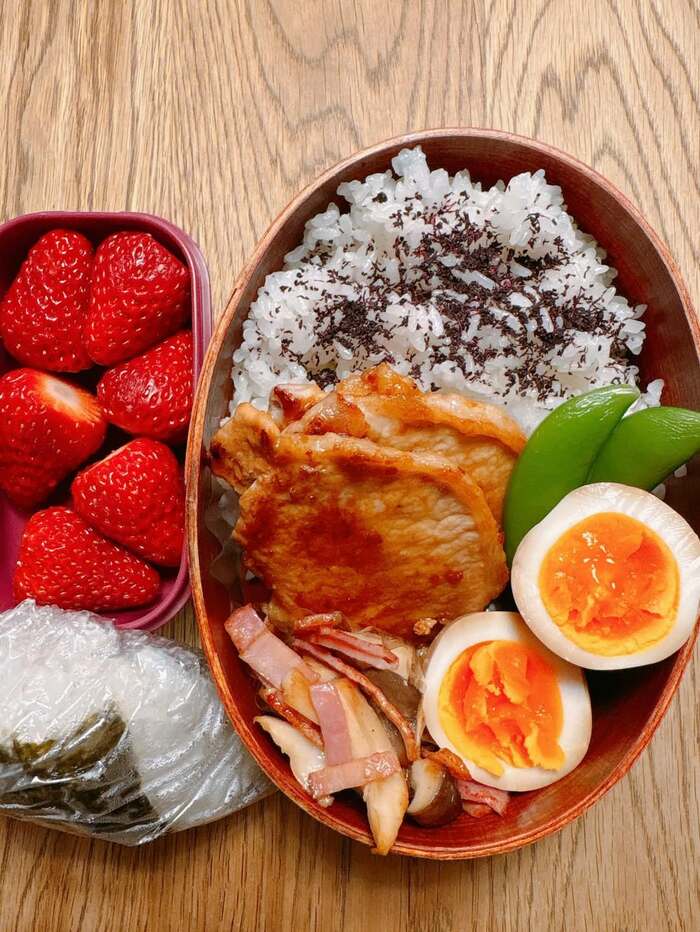 メインのお肉だけでなく、緑のスナップエンドウや真っ赤ないちごがあることで、色とりどりのお弁当に仕上がっているのが、さすが坂下さん!