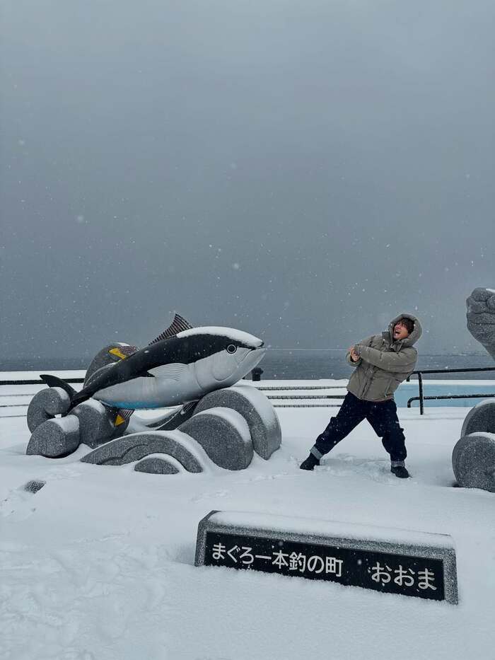 公開された写真には「まぐろ一本釣の町 おおま」と記された場所で、大きなマグロのオブシェを釣り上げるように引っ張っている大倉さんの姿が。辺り一面雪景色で、迫力ある表情を浮かべる大倉さんの口からも白い息がふわり。大倉さんいわく、この日は「40年ぶりの記録的積雪の日でやばかった」そうで、その寒さがひしひしと伝わってきます。