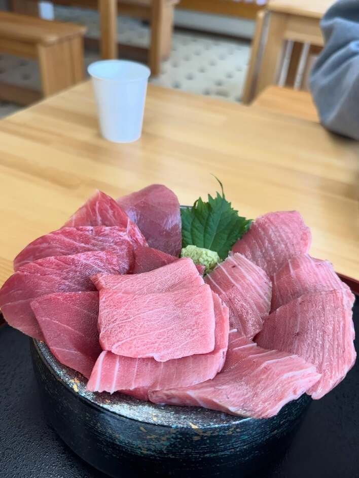 写真には、マグロの刺身がふんだんにのった丼がとらえられています。器からはみ出しているのに加え、盛りすぎていてご飯が見えなくなるほど!厚めに切られた刺身は、明らかに脂がのっているピンク色をしていて、そのビジュアルに食欲をそそられます。