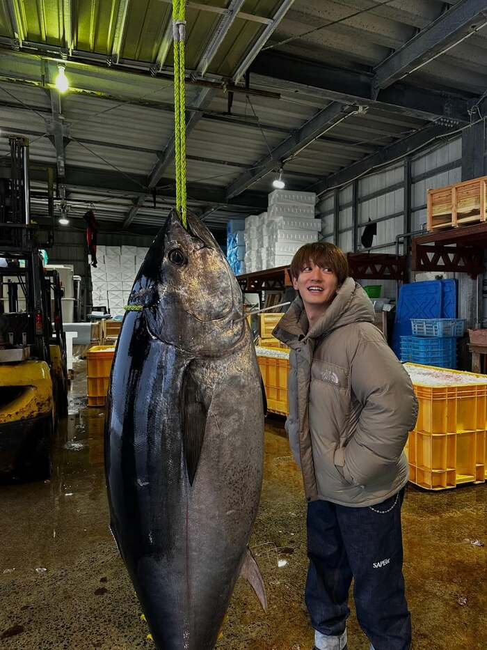 公開された写真には、巨大な高級魚・クロマグロと並んだ大倉さんの姿が!