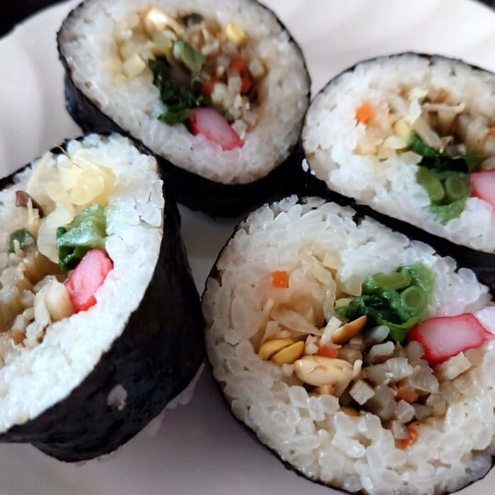 お皿に盛り付けられた太巻きの断面を見てみると、多種類の食材を使ったあえ物のような物や葉物野菜が、白米と一緒にギュッとのりで巻き付けられている様子が伺えます。