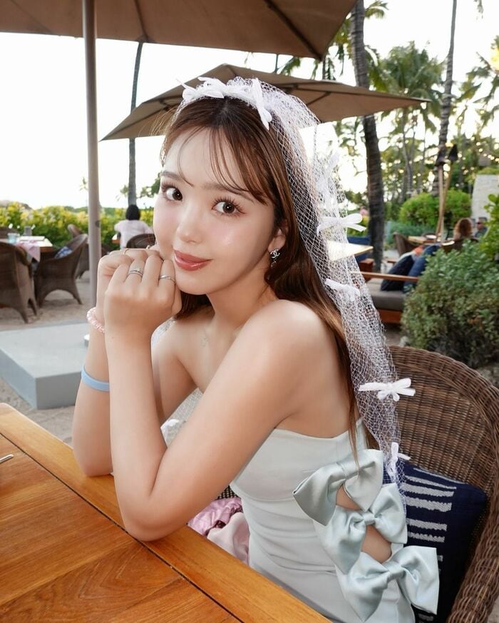 テーブルに肘を乗せ、こちらを見つめる様子も披露しており、左手の薬指には光り輝く指輪をはめています。