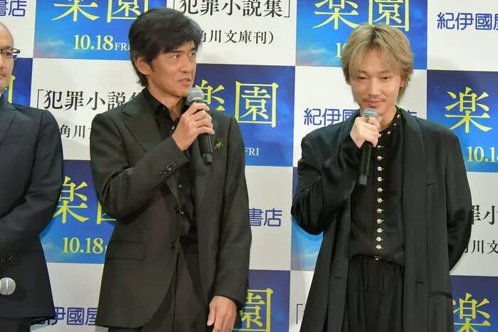 「人が目指す楽園というのはどこにあるのか、何を持って楽園とするのか、観ながら考えられる作品なので、いい意味での後味の悪さを感じてもらえると思います」と佐藤が語ると「素晴らしいお言葉で…やっぱり浩市さんを後にすればよかった」とシュンとする綾野だった。