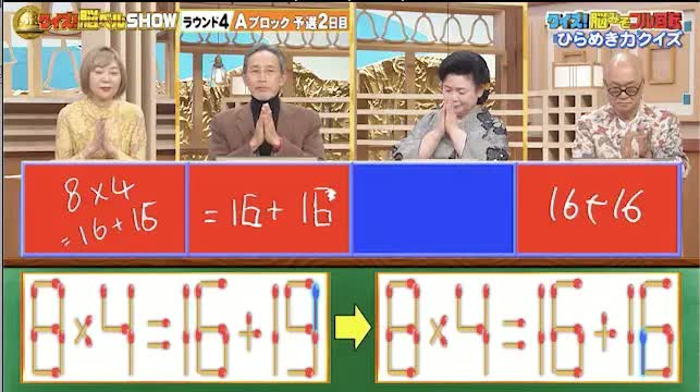 正解はまず、右の式の「9」から1本を動かし「6」にします。そうすれば「8×4=16+16」となります。室井さん、垂水さん、田山さんが正解。
