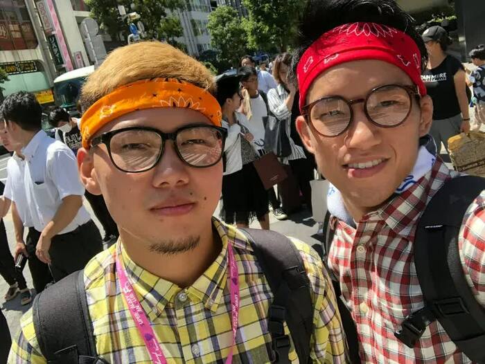 えー?誰?なんと右の赤い服の男性が海選手。秋葉原にて“ヲタク”風ファッションで撮影したという。