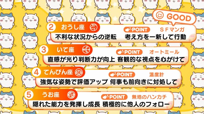 『めざましテレビ』で放送中の「ちいかわ占い」 テレビ放送がない日はお休みで、月~土:朝7時以降に更新予定です。