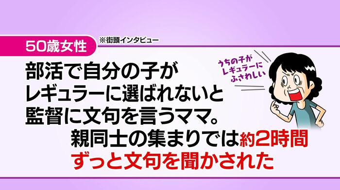 街頭インタビューでも、「自分の子どもが部活でレギュラーに選ばれないのが不満なママが、監督に文句を言うだけでなく、約2時間もその話を続けていた」とある女性が打ち明けました。