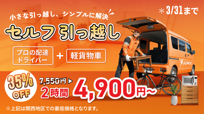 24時間365日、アプリひとつで即時配送を手配できるプラットフォーム「Lalamove(ララムーブ)」を運営するLalamove Japan 株式会社(本社:東京都品川区、日本責任者:中澤 英誠、以下Lalamove)は、引越しシーズン本番に向け、単身引越しを応援する「セルフ引っ越し配送」の35%OFFキャンペーンを2026年3月末日まで実施いたします。また、お客様の利便性向上のため、新たに「荷積み・荷下ろし要員」の追加オプションの提供を開始したことをお知らせいたします。