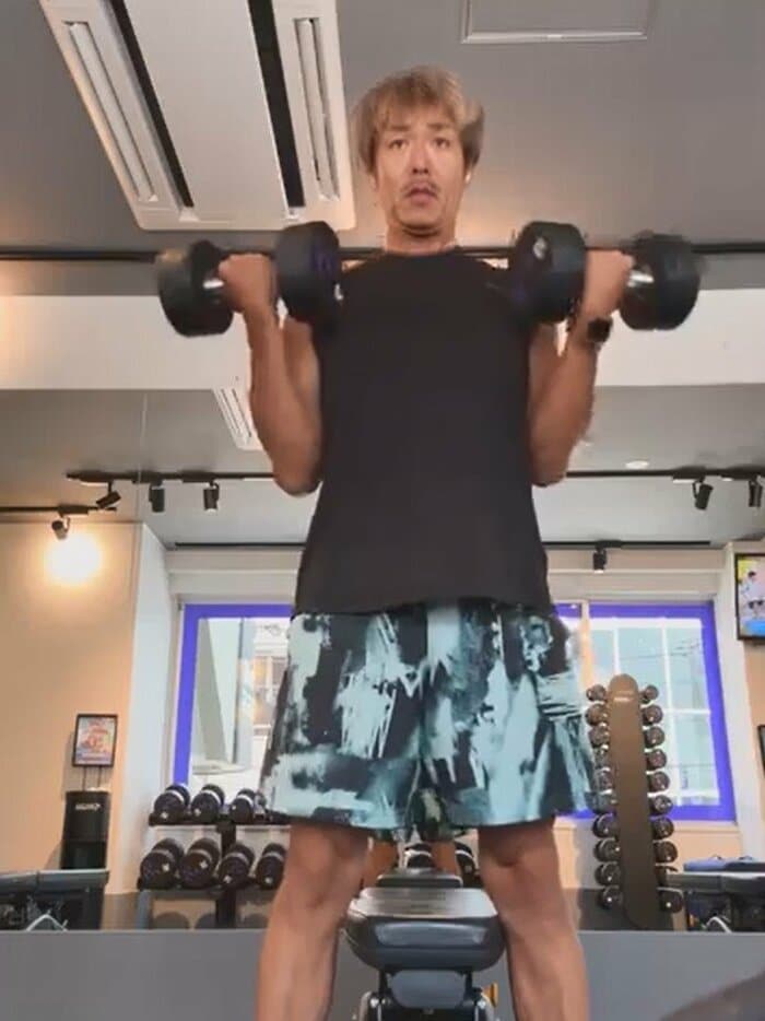 肘を曲げて、ダンベルを胸の前に持ち上げた藤田さん。