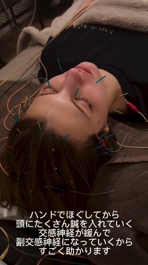 頭や顔にたくさんのはりを入れるはり治療で全身のケアは完了!マギーさんは「交感神経が緩んで副交感神経になっていくからすごく助かります」と、はり治療のありがたみをつづっています。