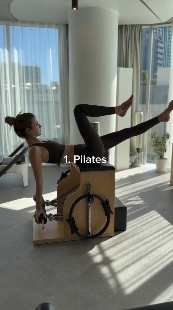 今度は、リフォーマーに膝を立てて座り、背後の固定台に置いた手で体を支えながら、大きく背中を反らせたポーズを披露。すらっとしたボディラインが際立っていて、日頃のトレーニングの積み重ねを感じさせる1枚となっています。