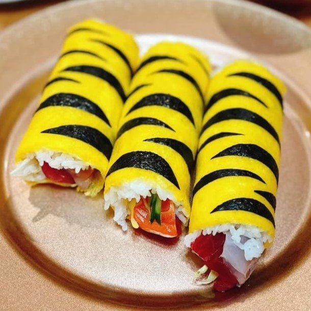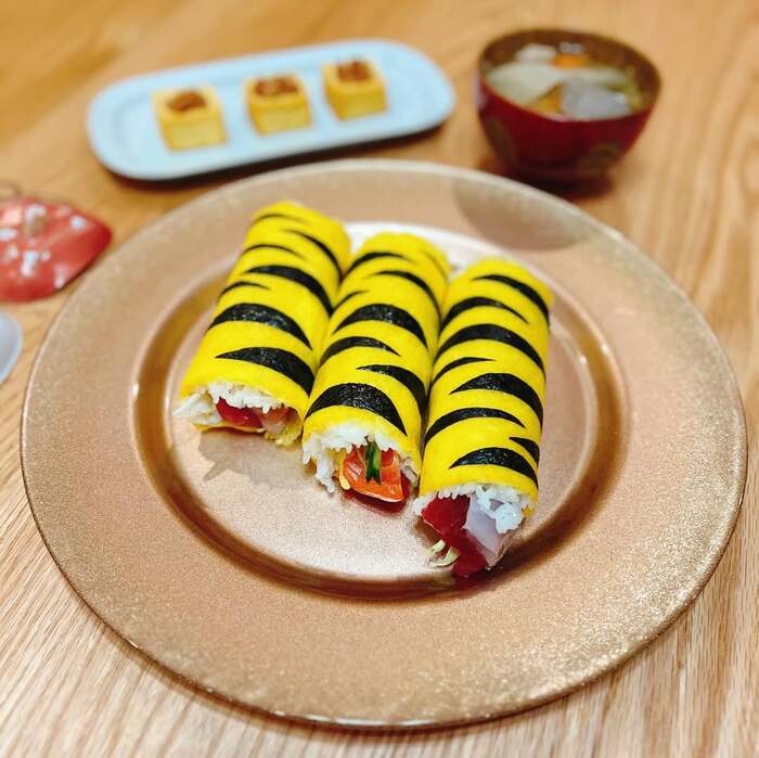 写真には、海苔の部分が、黄色×黒色の縞模様で作られた恵方巻きが3本並んでいます。
