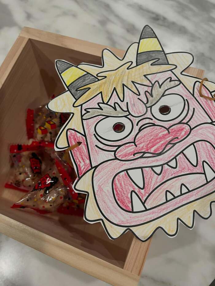 今回の投稿では、豆の小袋が入った升と赤や黄色などの色が塗られた鬼のお面を公開し、「#節分」「#豆まき」と、豆まきを楽しんだことを報告しました。