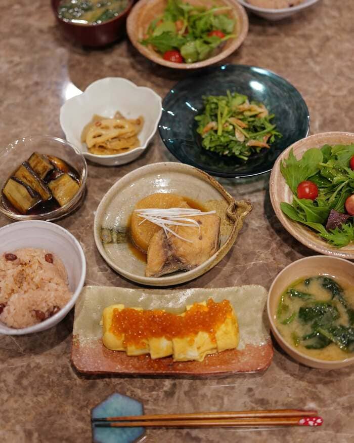 副菜には、左から順にナスの煮浸し、れんこんのきんぴら、春菊のナムル、ミニトマトを乗せたサラダなどが並び、彩り豊かで栄養バランスも抜群の献立になっています。