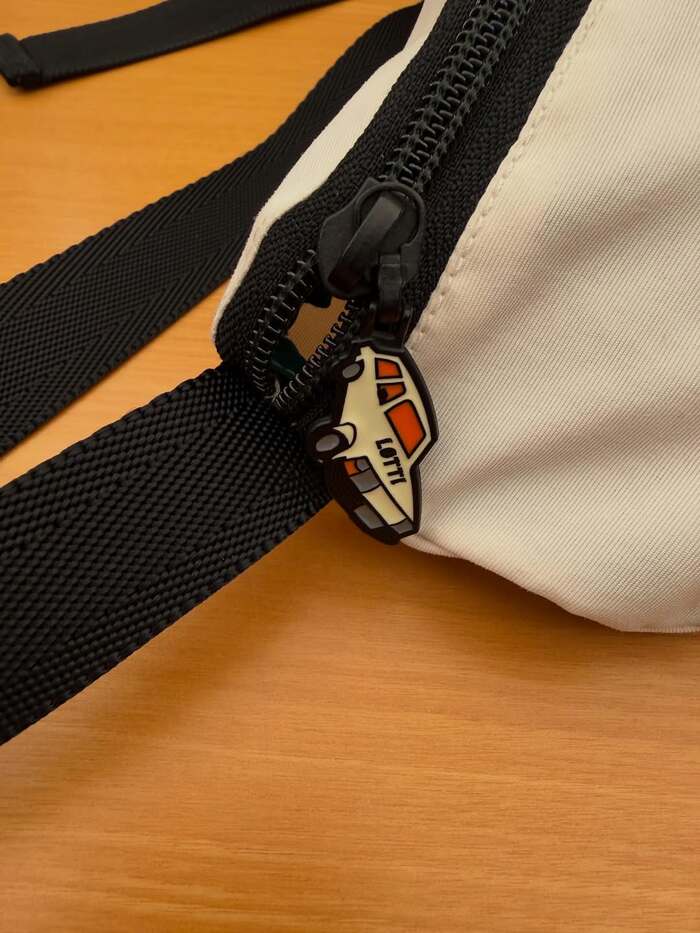 チャックやひも部分はシンプルに黒色。よーく見ると、チャックには「LOTTI」とコンビ名が書かれた小さな車がぶらさがっていて、遊び心もあふれています。