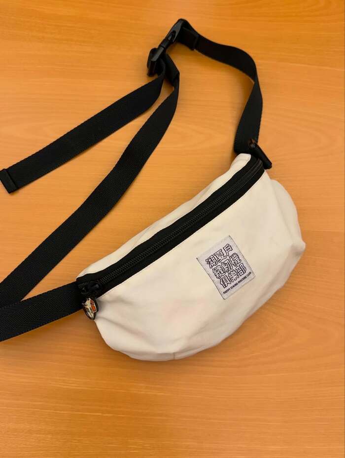 実際に完成したウエストポーチを見ると、ミシンクラブと書いてあるのでしょうか、真っ白なポーチに漢字が連なったロゴが付けられています。また、小さく「HAPPY SEWING MACHINE CLUB」と書かれていて、ミシンへの愛が込められています。
