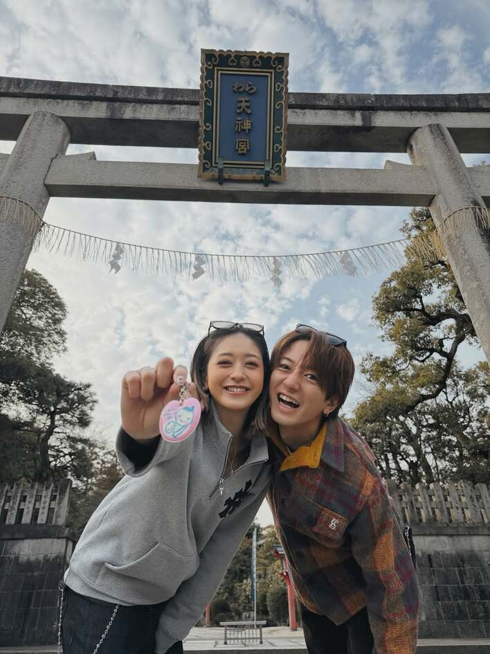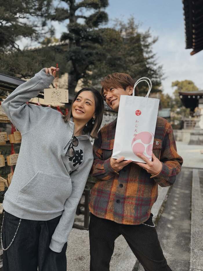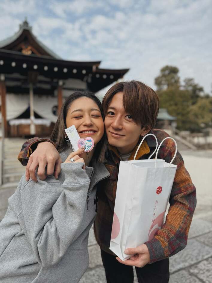 神社の鳥居を背景に、満面の笑みで寄り添った2人。池田さんの手には、マタニティマークが握られています。