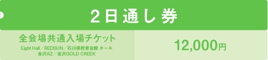 全会場共通入場チケット(Eight Hall / REDSUN / 石川県教育会館 ホール / 金沢AZ / 金沢GOLD CREEK)各1日券とお得な2日通し券の販売となります。