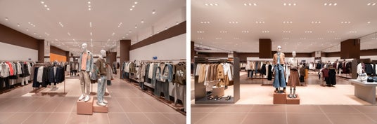 店舗デザインは、自然環境と都市開発が織りなす空間的な関係性に着目し、テクノロジー、ファッション、そしてソーシャルライフが交差する場を、テーマとしています。土の質感を想起させる、アースカラーの煉瓦調ペイントが、自然と現代文明との対話を表現し、強い視覚的インパクトの大型のデジタルスクリーンが、ショッピングと人々の交流を、シームレスにつないでいます。ブランド哲学を体現するように、一見相反する要素が調和しながら融合した、多様性と統一感を併せ持つURらしい空間となっています。