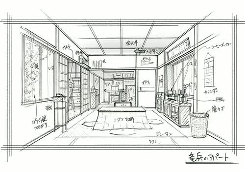 「竜兵のアパート」は、世を忍んで古いアパートに住んでいるけれども、部屋の中をよく見ると忍者の要素があふれ出ちゃっている感じを、忍びの紋や小道具などで表現しました。