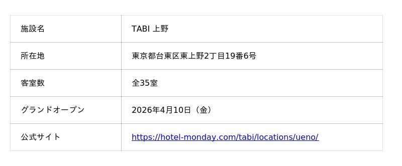 株式会社JHAT(本社:東京都、代表取締役:平林 朗)は、2026年4月10日(金)、東京・上野エリアに新ブランド「TABI」の第一号店となるアパルトホテル「TABI 上野」を開業いたします。