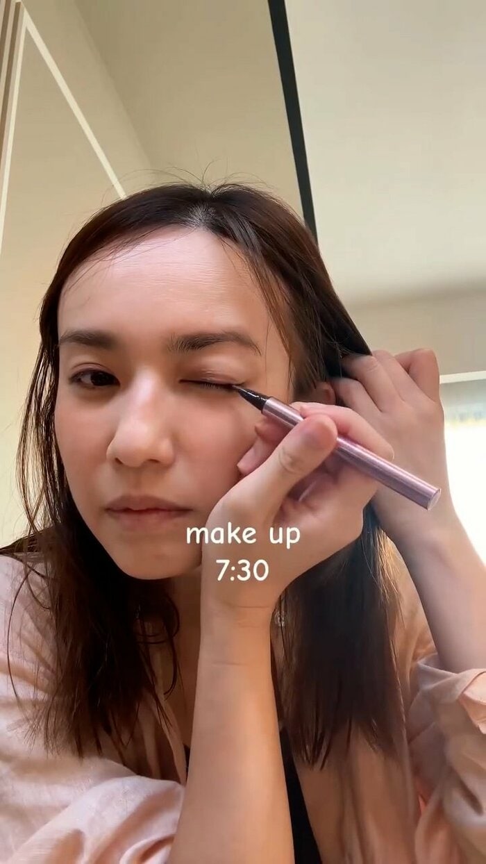 そして、太陽が差し込む部屋でメイクをしていきます。アイラインを引いて、着々と準備を進めていき…この時、時刻は午前7時半。