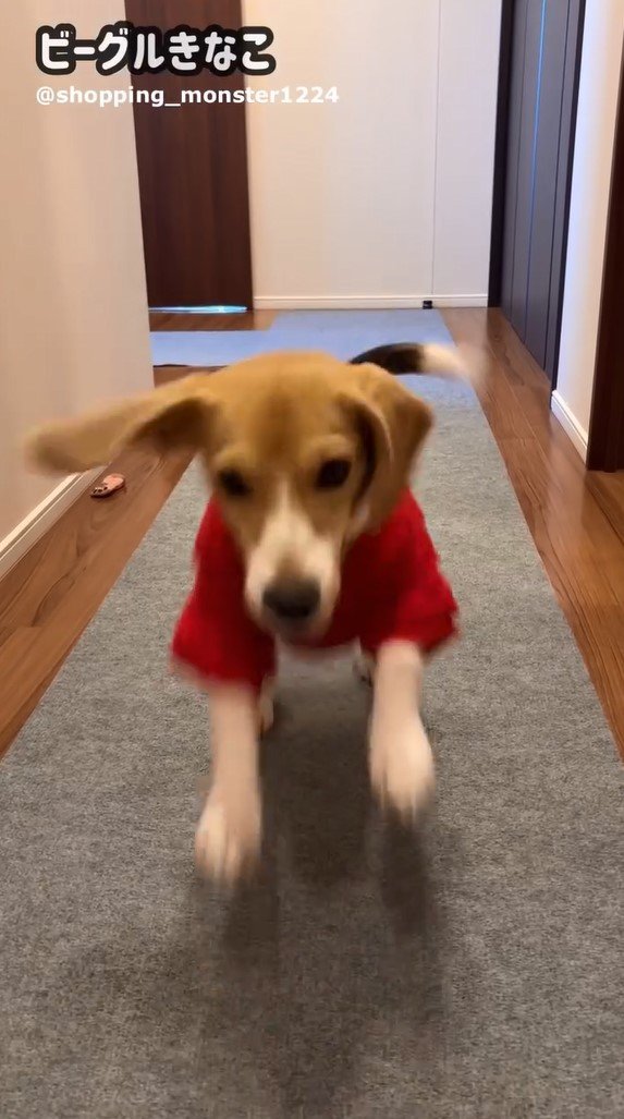 最後は、廊下の奥から元気よくこちらに向かって走り、ようやく靴下に慣れたのかと思いきや…廊下の左側をよく見てみると、ピンク色の靴下が脱ぎ捨てられてしまっているではありませんか!