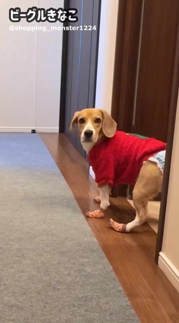 しかし、初めて「犬用の靴下」を履いてみたところ、お気に召さなかったのでしょうか。ちょっぴりしょんぼり。