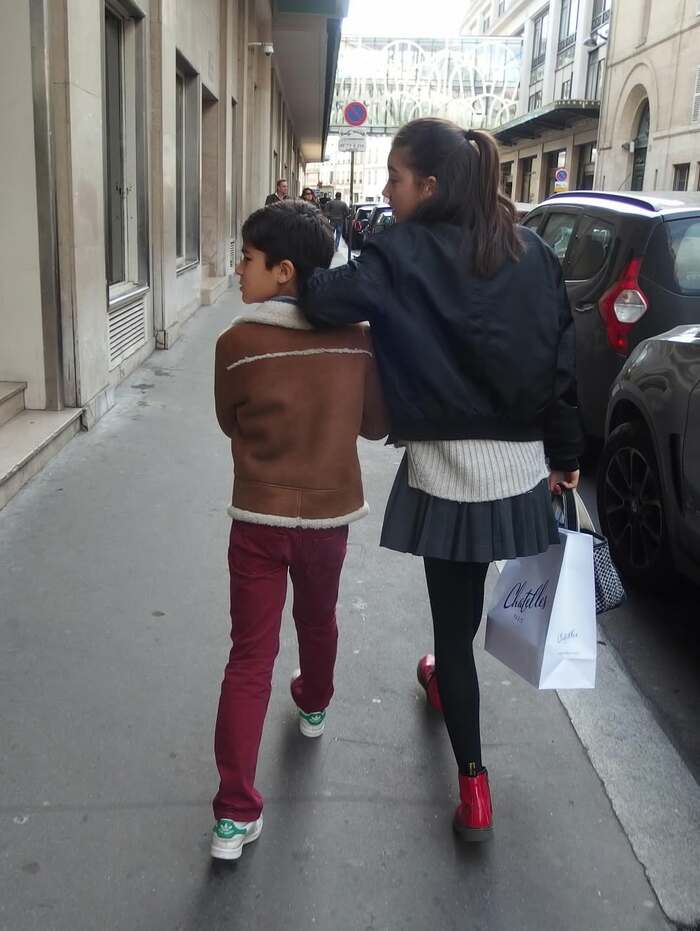 他にも、パリでの様子でしょうか、赤のパンツにブラウンのジャケットを羽織った次男の肩に、ミニスカート姿の長女が手をかける仲むつまじい様子も。2人とも歩き方や顔を向けた方向が同じで息ぴったりです。
