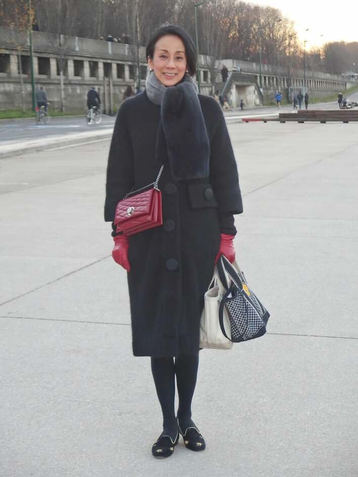 中村さんのソロショットを見ると、開放感あふれる公園のような場所で、ネイビーのコートにマフラーを巻いた姿で、笑顔を浮かべてたたずんでいます。肩に赤のバッグをかけるだけでなく、手には編み模様のバッグと小さな白のトートバッグを持っています。