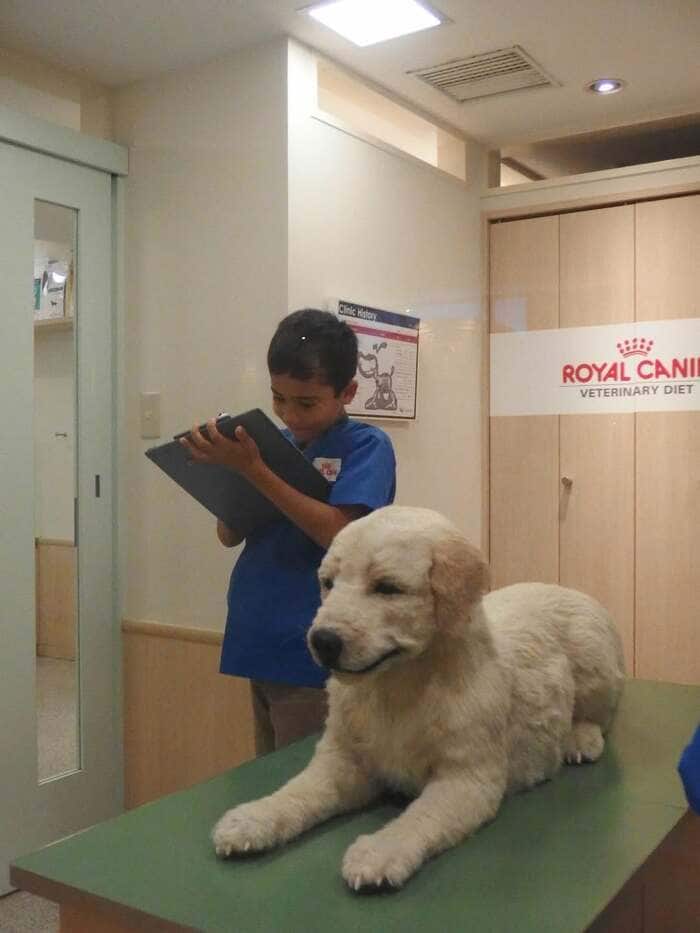 また、「東京に行けば、真っ先にキッザニアの予約を入れ、行く度にふらふらになって帰宅。」とつづり、本格的な職業体験に夢中になる長男の姿を公開!この時は獣医師に挑戦したようで、ワンちゃんの隣で真剣な表情を浮かべながらシートを記入していました。