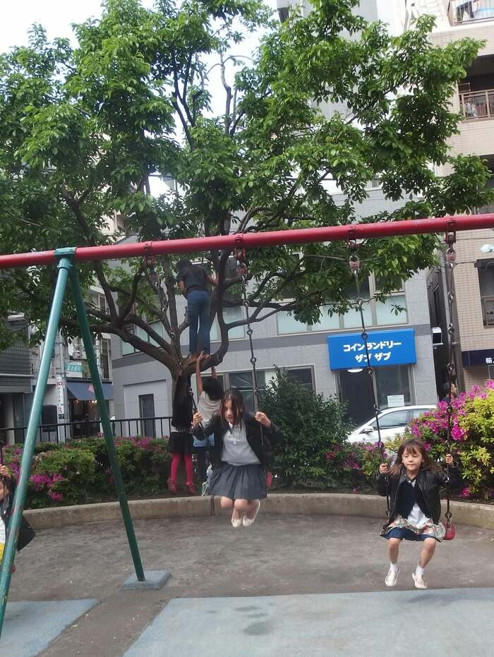 続いて、「必死にブランコ押したり」とつづった写真には、制服姿の長女と次女がそれぞれブランコをこぐ様子が収められています。後ろには「コインランドリー」と日本語が書かれており、日本に滞在していた時であることがうかがえます。