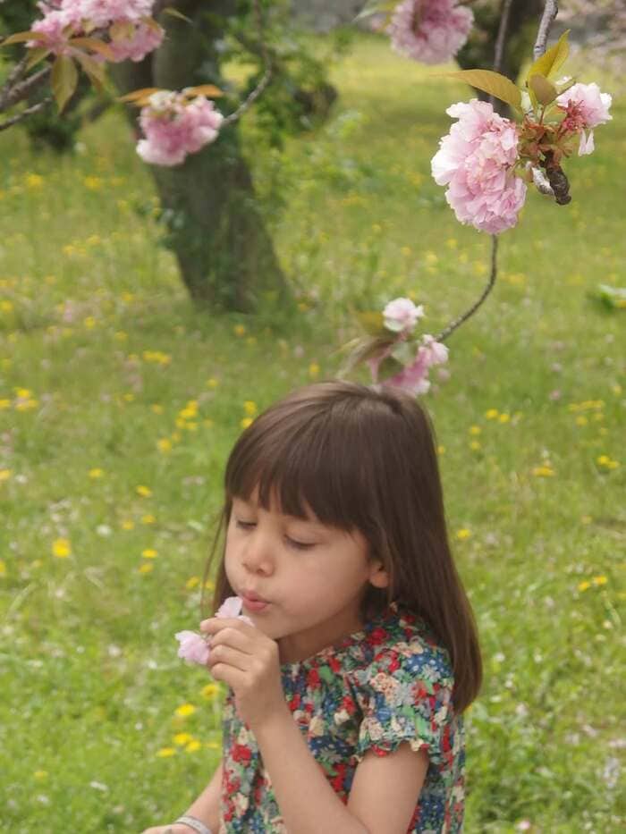 さらに、一面緑色の公園でピンクのお花を持ち、ふうと優しく息を吹きかける次女の姿も披露。純粋無垢(むく)なショットに、思わず心が癒やされてしまいます。
